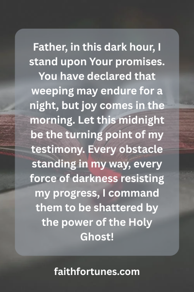 Father, in this dark hour, I stand upon Your promises. You have declared that weeping may endure for a night, but joy comes in the morning. Let this midnight be the turning point of my testimony. Every obstacle standing in my way, every force of darkness resisting my progress, I command them to be shattered by the power of the Holy Ghost!