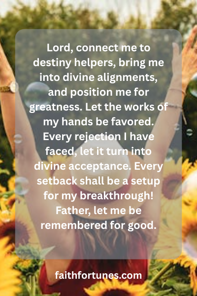 Lord, connect me to destiny helpers, bring me into divine alignments, and position me for greatness. Let the works of my hands be favored. Every rejection I have faced, let it turn into divine acceptance. Every setback shall be a setup for my breakthrough! Father, let me be remembered for good.