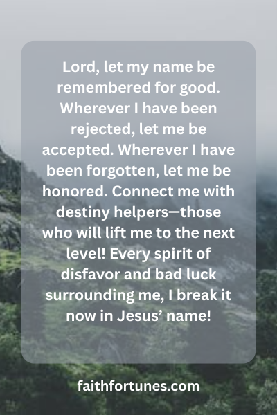 Lord, let my name be remembered for good. Wherever I have been rejected, let me be accepted. Wherever I have been forgotten, let me be honored. Connect me with destiny helpers—those who will lift me to the next level! Every spirit of disfavor and bad luck surrounding me, I break it now in Jesus’ name!