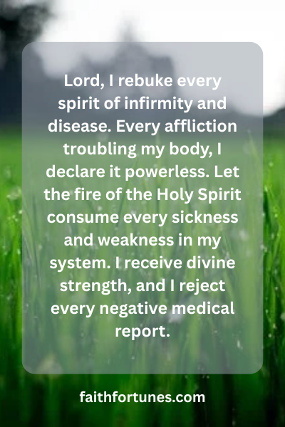 Lord, I rebuke every spirit of infirmity and disease. Every affliction troubling my body, I declare it powerless. Let the fire of the Holy Spirit consume every sickness and weakness in my system. I receive divine strength, and I reject every negative medical report.