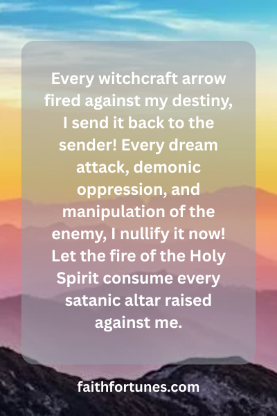 Every witchcraft arrow fired against my destiny, I send it back to the sender! Every dream attack, demonic oppression, and manipulation of the enemy, I nullify it now! Let the fire of the Holy Spirit consume every satanic altar raised against me.