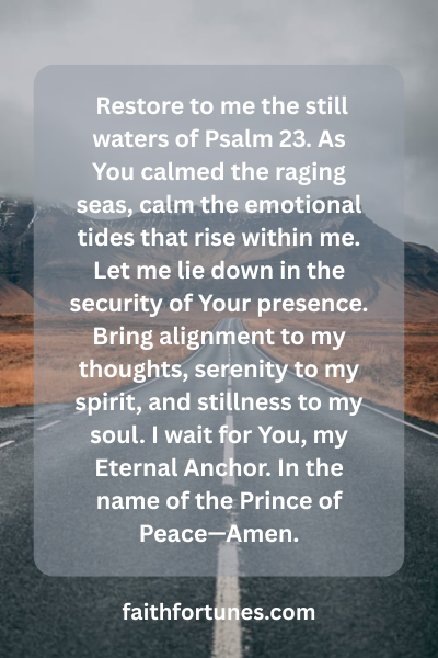Restore to me the still waters of Psalm 23. As You calmed the raging seas, calm the emotional tides that rise within me. Let me lie down in the security of Your presence. Bring alignment to my thoughts, serenity to my spirit, and stillness to my soul. I wait for You, my Eternal Anchor. In the name of the Prince of Peace—Amen.