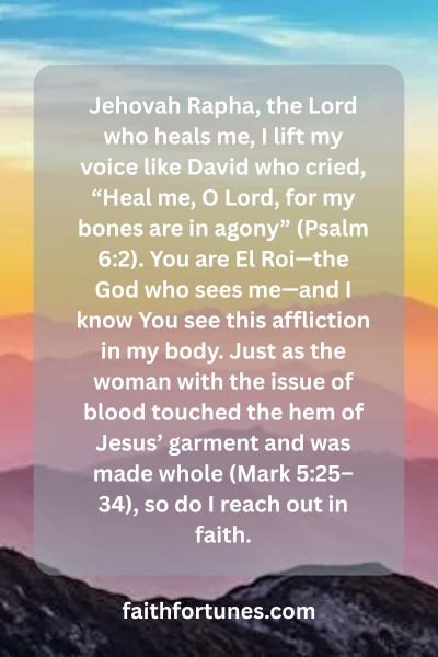 Jehovah Rapha, the Lord who heals me, I lift my voice like David who cried, “Heal me, O Lord, for my bones are in agony” (Psalm 6:2). You are El Roi—the God who sees me—and I know You see this affliction in my body. Just as the woman with the issue of blood touched the hem of Jesus’ garment and was made whole (Mark 5:25–34), so do I reach out in faith.
