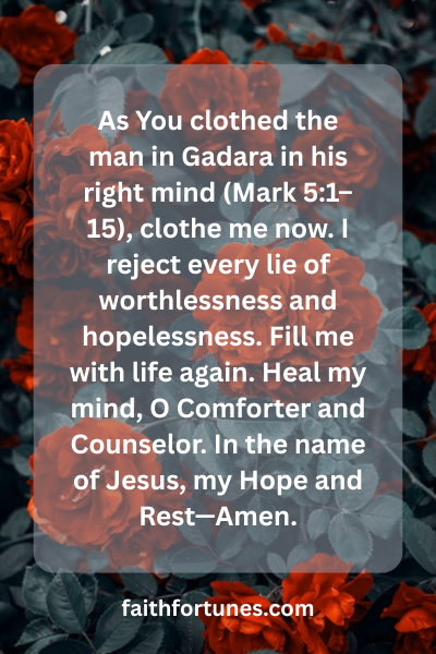 As You clothed the man in Gadara in his right mind (Mark 5:1–15), clothe me now. I reject every lie of worthlessness and hopelessness. Fill me with life again. Heal my mind, O Comforter and Counselor. In the name of Jesus, my Hope and Rest—Amen.