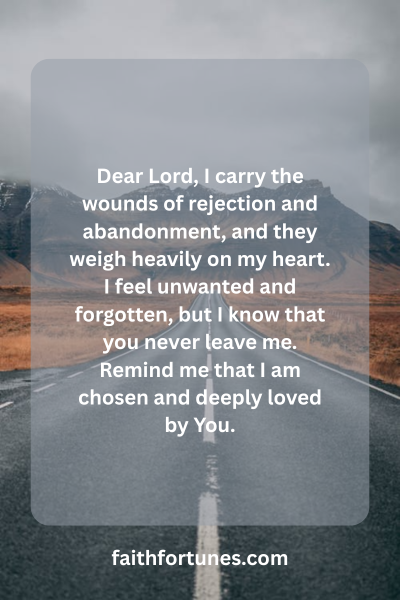 Dear Lord, I carry the wounds of rejection and abandonment, and they weigh heavily on my heart. I feel unwanted and forgotten, but I know that you never leave me. Remind me that I am chosen and deeply loved by You.