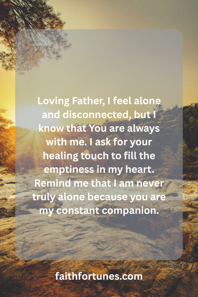 Loving Father, I feel alone and disconnected, but I know that You are always with me. I ask for your healing touch to fill the emptiness in my heart. Remind me that I am never truly alone because you are my constant companion.