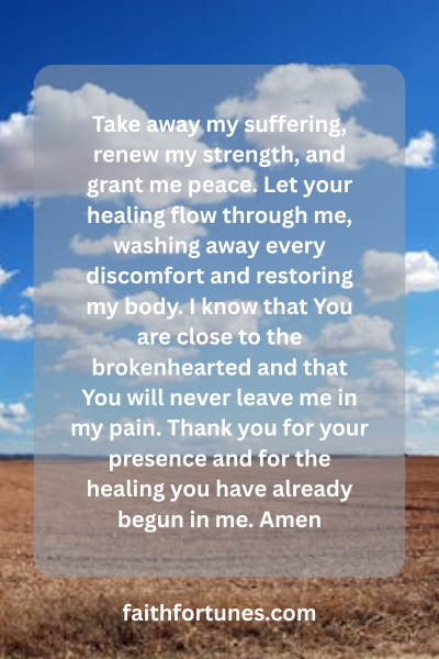 Take away my suffering, renew my strength, and grant me peace. Let your healing flow through me, washing away every discomfort and restoring my body. I know that You are close to the brokenhearted and that You will never leave me in my pain. Thank you for your presence and for the healing you have already begun in me. Amen.