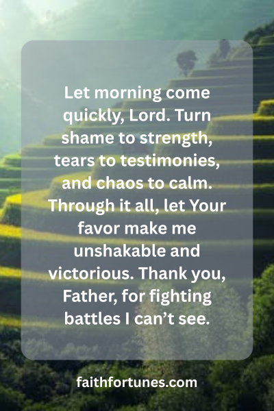 Let morning come quickly, Lord. Turn shame to strength, tears to testimonies, and chaos to calm. Through it all, let Your favor make me unshakable and victorious. Thank you, Father, for fighting battles I can’t see.
