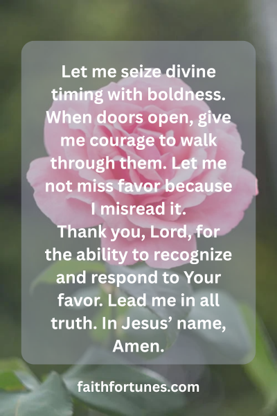 Let me seize divine timing with boldness. When doors open, give me courage to walk through them. Let me not miss favor because I misread it.
