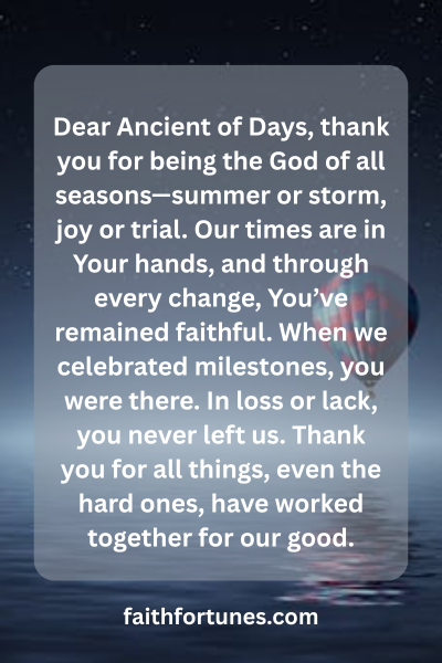Dear Ancient of Days, thank you for being the God of all seasons—summer or storm, joy or trial. Our times are in Your hands, and through every change, You’ve remained faithful. When we celebrated milestones, you were there. In loss or lack, you never left us. Thank you for all things, even the hard ones, have worked together for our good. Like Joseph, you’ve turned what was meant for harm into blessing. May we always honor You in every chapter of life, knowing that You’re scripting a beautiful story through our family. Be glorified in all our seasons, Lord.
