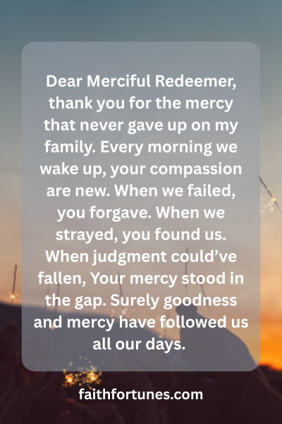 Dear Merciful Redeemer, thank you for the mercy that never gave up on my family. Every morning we wake up, your compassion are new. When we failed, you forgave. When we strayed, you found us. When judgment could’ve fallen, Your mercy stood in the gap. Surely goodness and mercy have followed us all our days. You saved us not because of righteous acts, but because of Your mercy and love. Let this mercy continue to cover every room, every heart, every decision. Let our home be a testimony of Your lovingkindness. Thank you, O God, whose mercy endures forever!