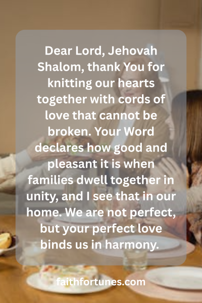 Dear Lord, Jehovah Shalom, thank You for knitting our hearts together with cords of love that cannot be broken. Your Word declares how good and pleasant it is when families dwell together in unity, and I see that in our home. We are not perfect, but your perfect love binds us in harmony. I bless you for peace that silences conflict and love that overrides offense. Let us remain one in purpose, in spirit, and in pursuit of You. May our unity attract more of Your glory, just as the early Church walked in one accord. Thank You, our Peace-Bringer.